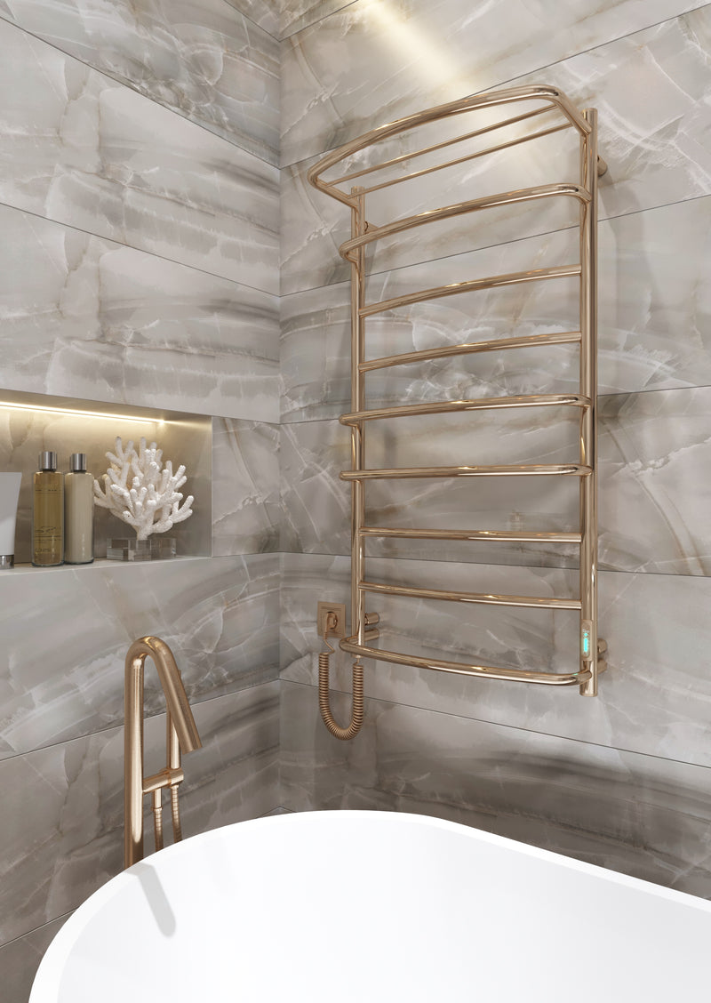 Śledząc światowe trendy wnętrzarskie, dołączyliśmy do naszego asortymentu grzejnik łazienkowy o pięknie błyszczącej złotej powłoce dla konsumentów preferujących ciepłe odcienie metalu. Suszarka łazienkowa elektryczna jest wykonana ze stali nierdzewnej, a jej powierzchnia złocona metodą PVD. Idealnie odpolerowana złota powłoka zachowuje swoje charakterystyki techniczne przez dziesiątki lat, a lustrzana powierzchnia urządzenia o wyszukanym złotym odcieniu podkreśli luksusową atmosferę wnętrza łazienki.