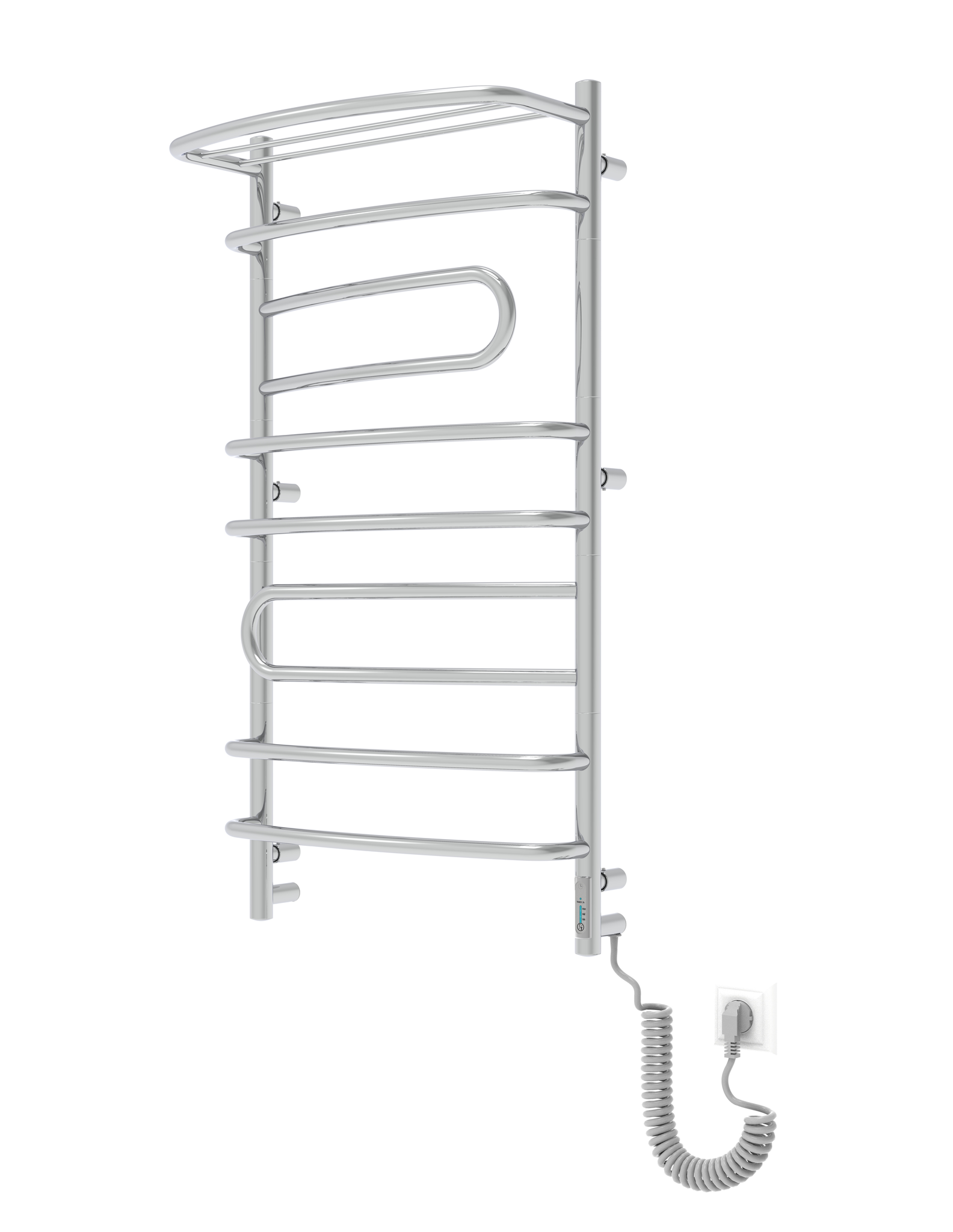 Elektryczny grzejnik łazienkowy Parus ze stali nierdzewnej ma 2 ruchome przęsła, każde z których obraca się o 180° niezależnie od drugiego, a także półkę, która pozwala na wygodne przechowywanie ręczników w łazience.
