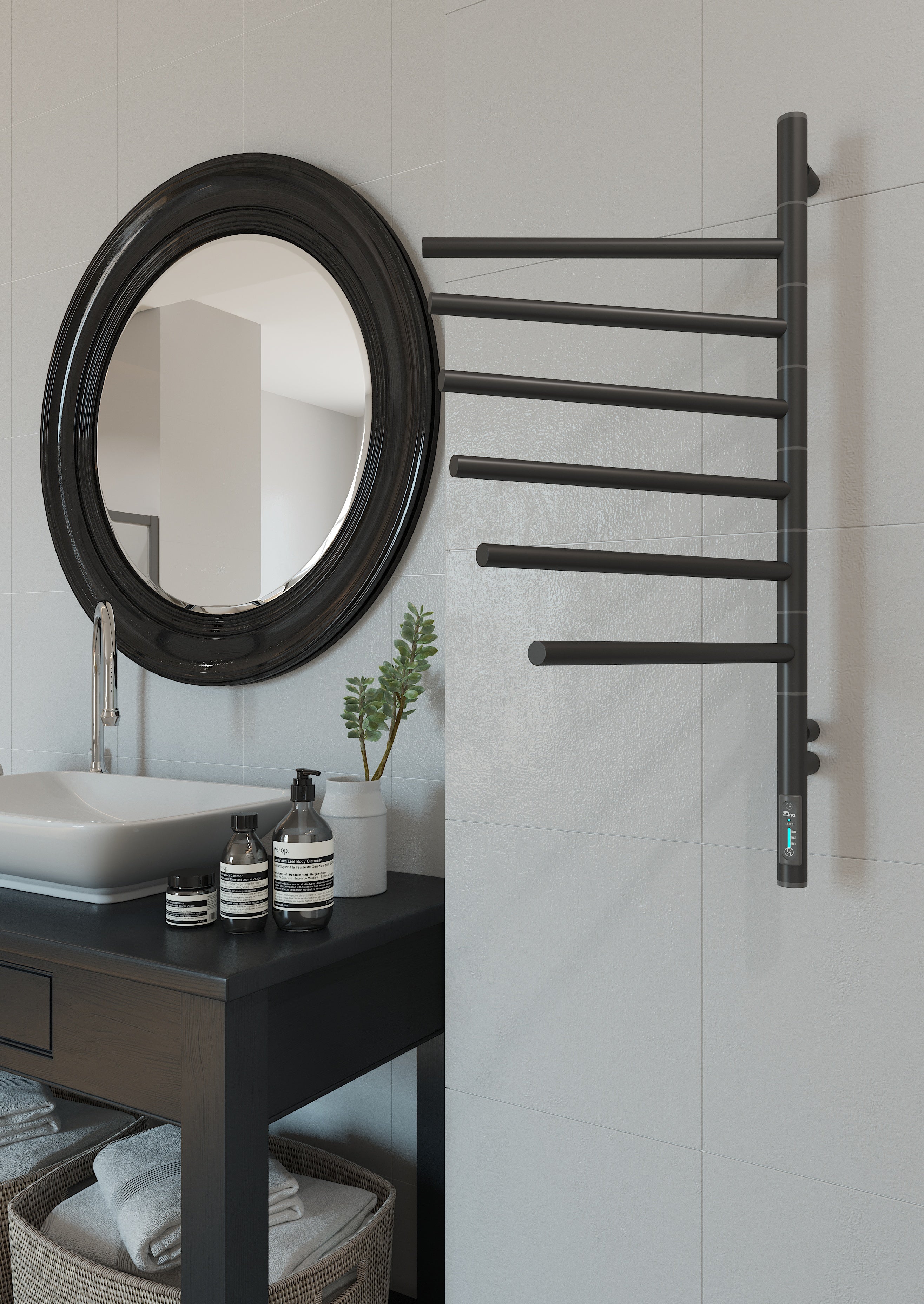 Elektryczny grzejnik łazienkowy Wertykal ze stali niskowęglowej ma 6 ruchomych przęseł, każde z których obraca się o 180° niezależnie od drugiego.