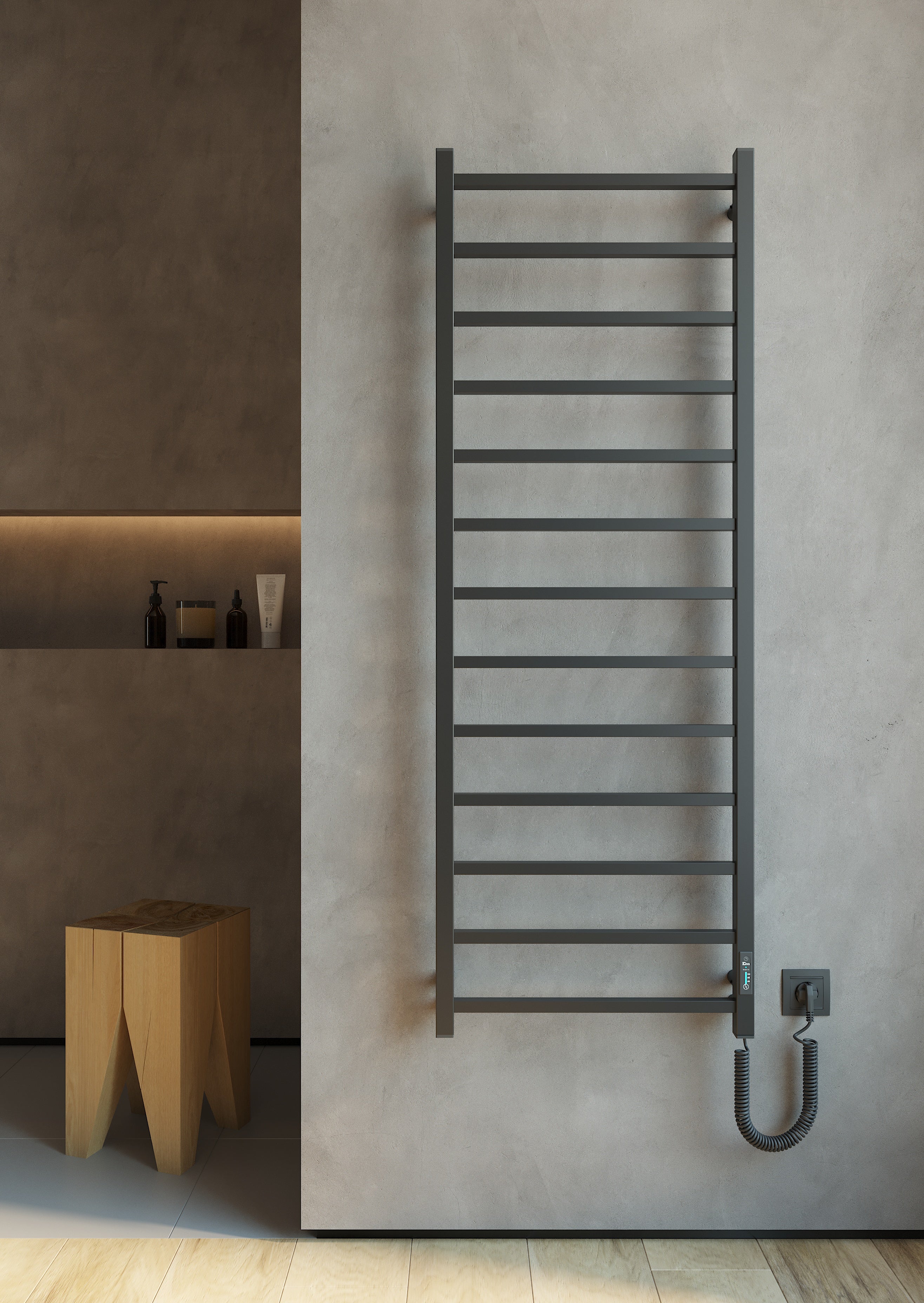 Elektryczny grzejnik łazienkowy Atria został wyprodukowany z myślą o konsumentach, którzy preferują industrialne kolory i minimalistyczne formy do tworzenia luksusowych przestrzeni łazienkowych.