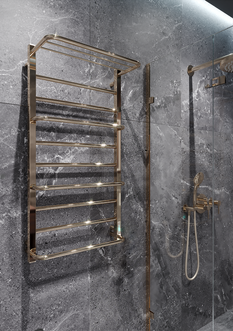 Śledząc światowe trendy wnętrzarskie, dołączyliśmy do naszego asortymentu grzejnik łazienkowy o pięknie błyszczącej złotej powłoce dla konsumentów preferujących ciepłe odcienie metalu. Suszarka łazienkowa elektryczna jest wykonana ze stali nierdzewnej, a jej powierzchnia złocona metodą PVD. Idealnie odpolerowana złota powłoka zachowuje swoje charakterystyki techniczne przez dziesiątki lat, a lustrzana powierzchnia urządzenia o wyszukanym złotym odcieniu podkreśli luksusową atmosferę wnętrza łazienki.