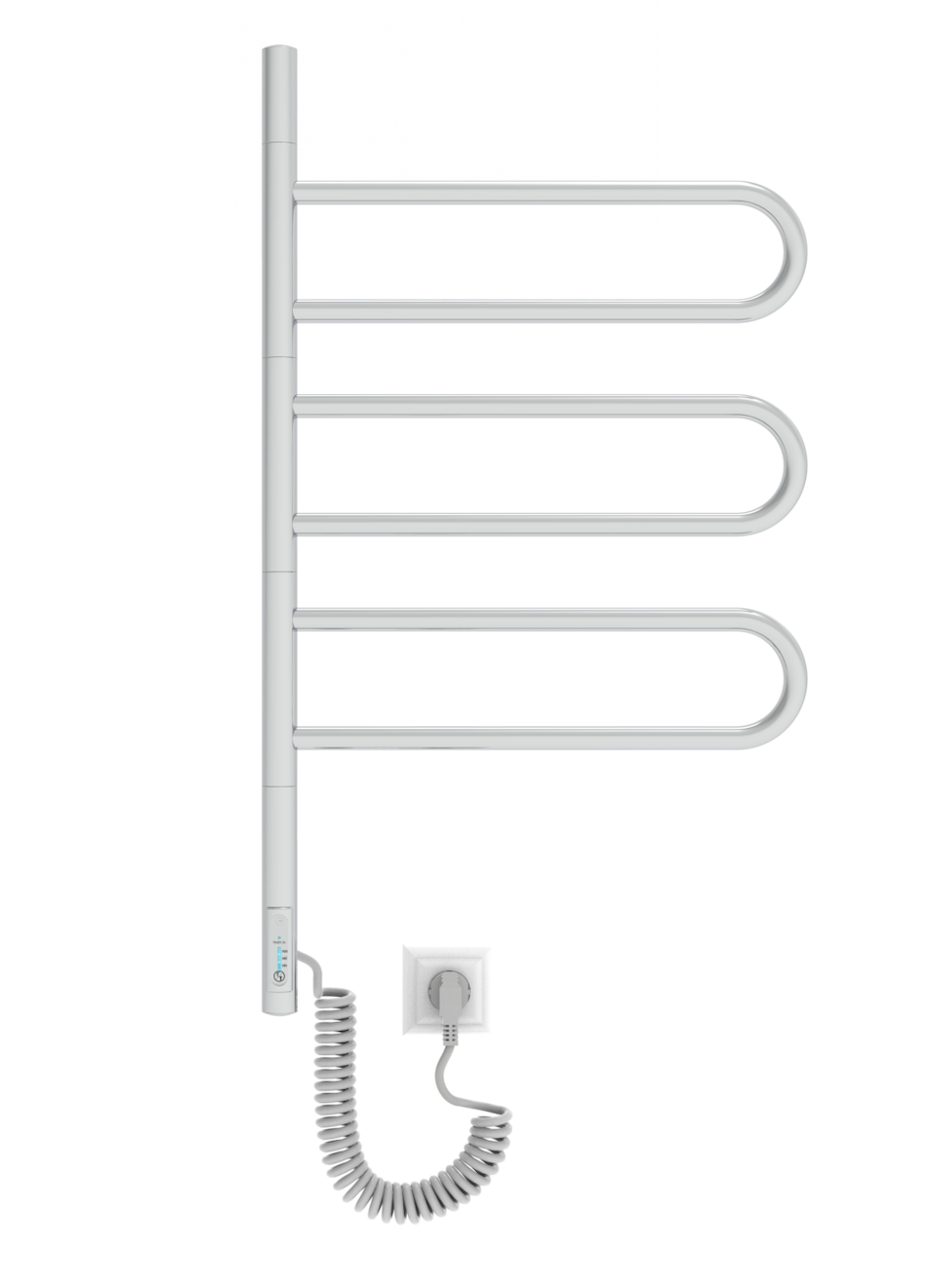 Elektryczny grzejnik łazienkowy Fluger ze stali nierdzewnej ma 3 ruchome przęsła, każde z których obraca się o 180° niezależnie od drugiego.