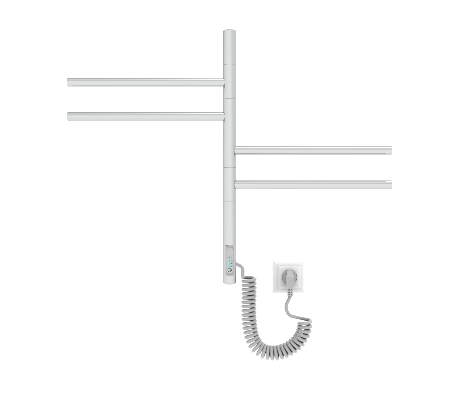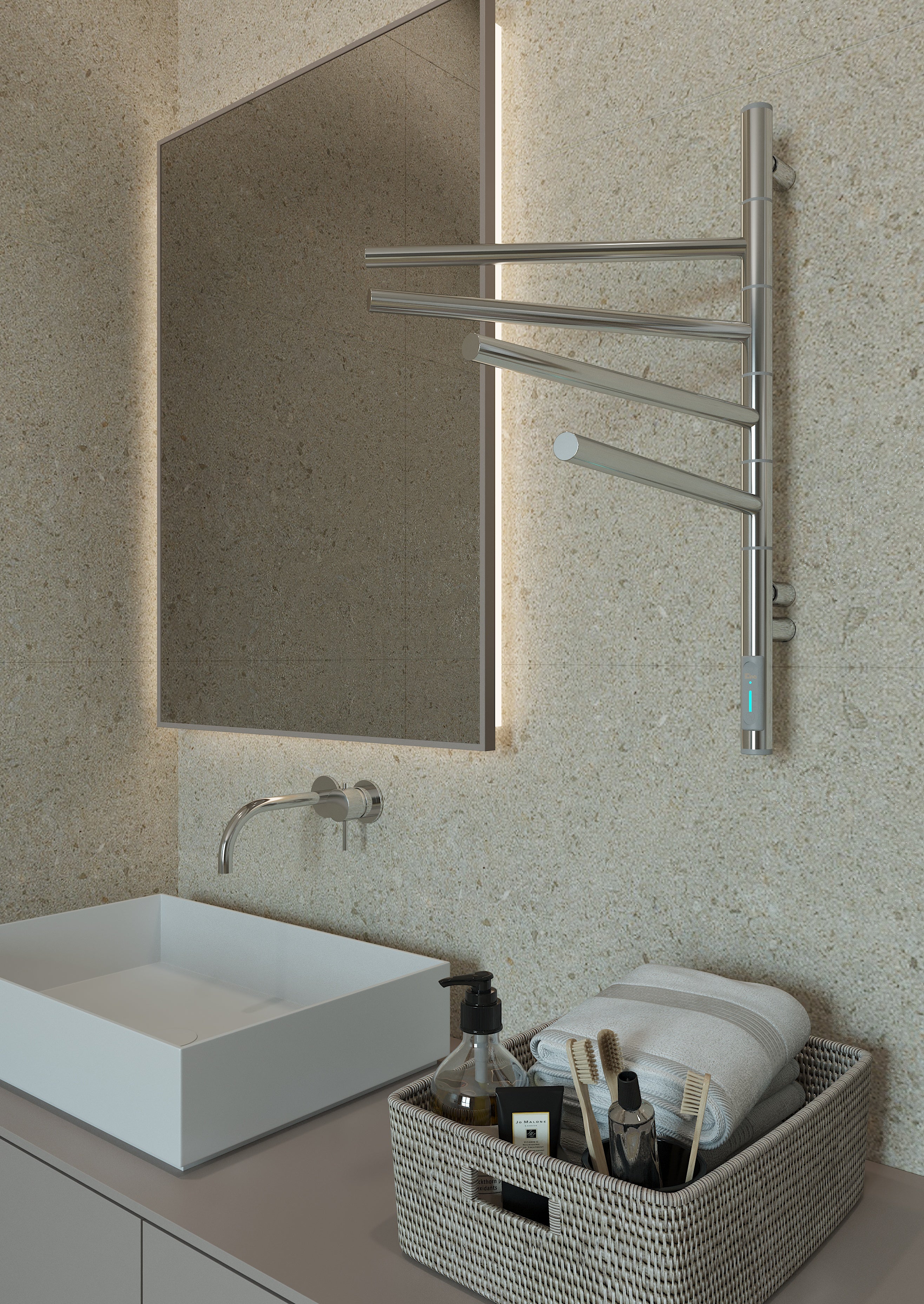 Elektryczny grzejnik łazienkowy Wertykal ze stali nierdzewnej ma 4 ruchome przęsła, każde z których obraca się o 180° niezależnie od drugiego.