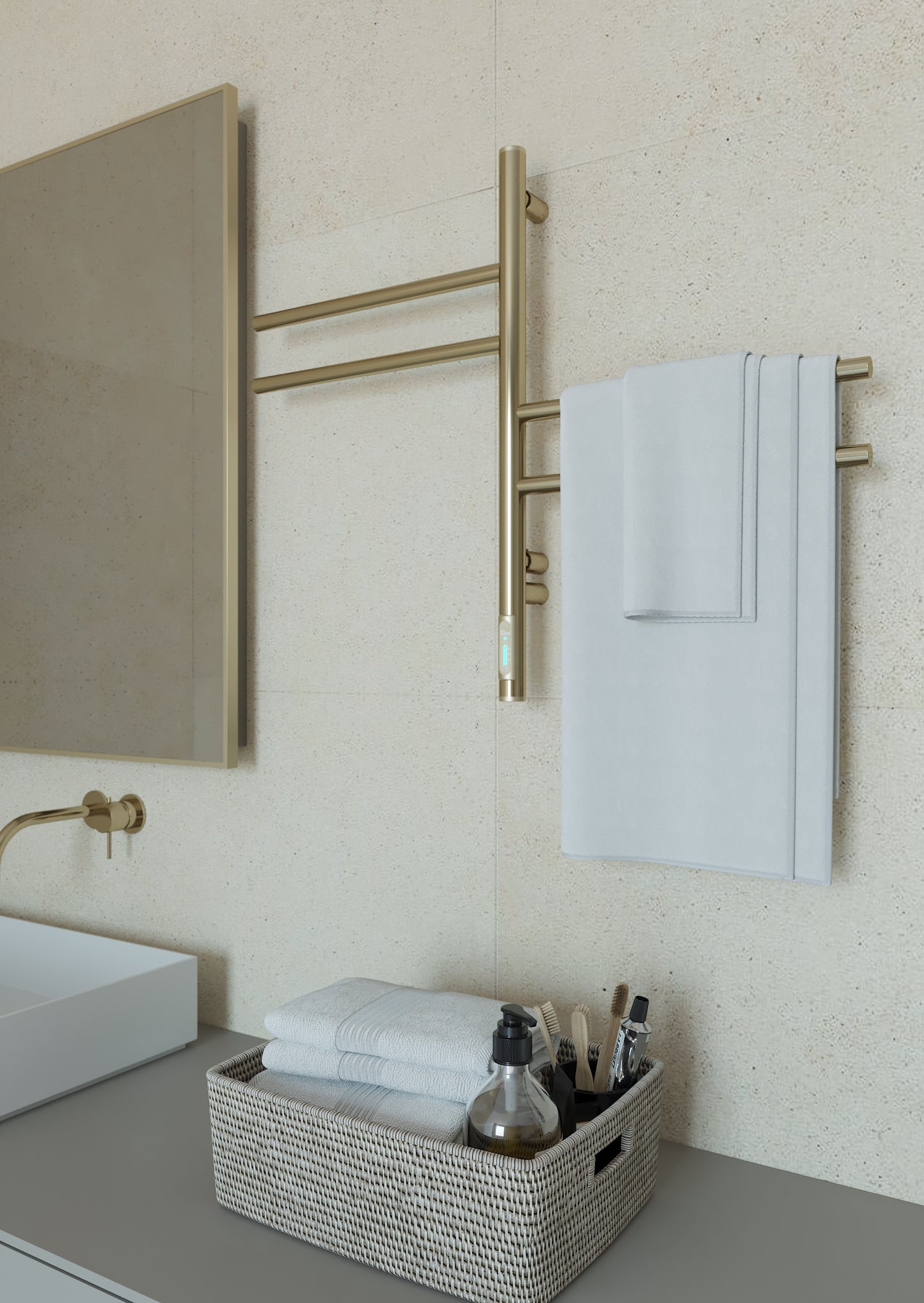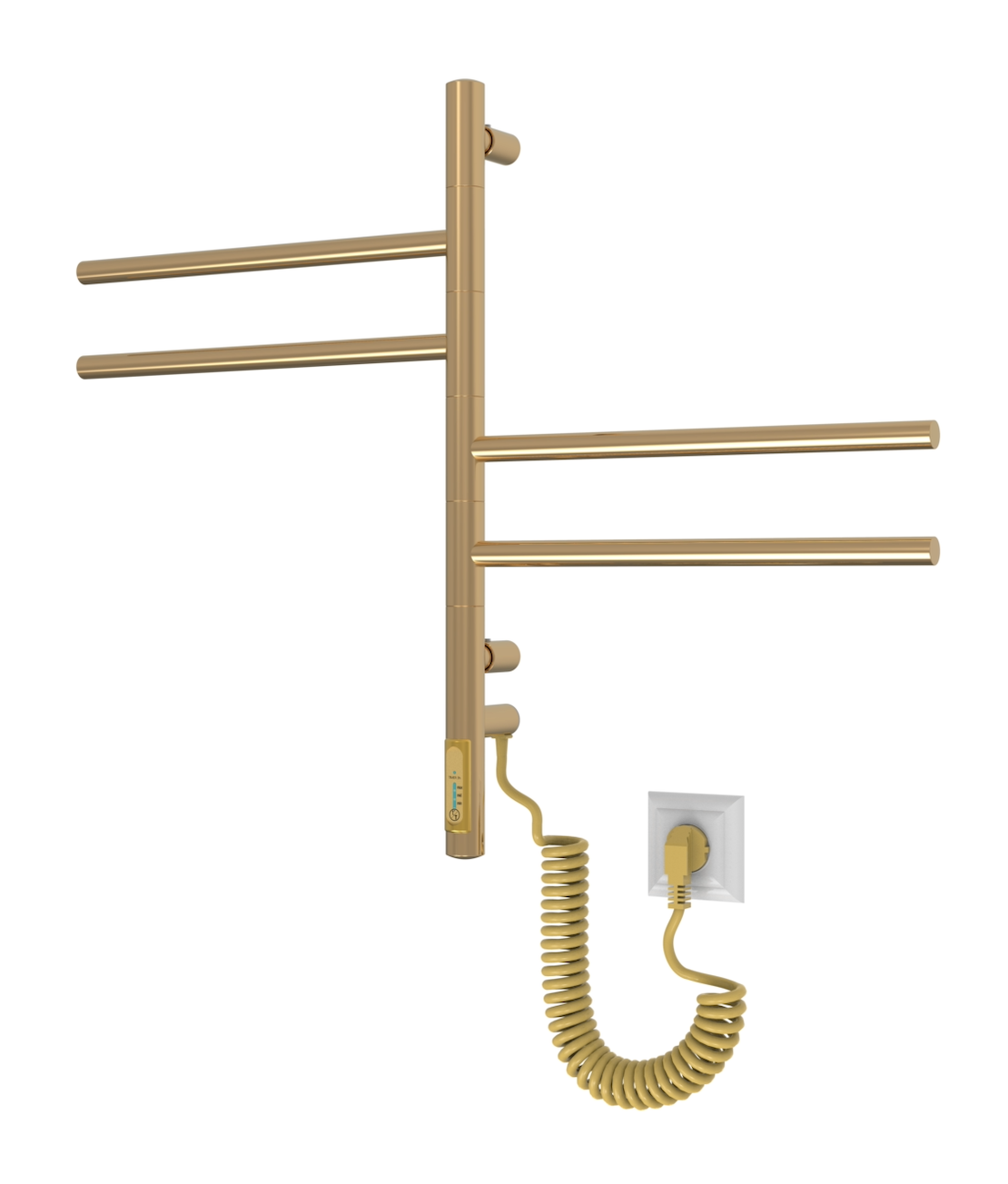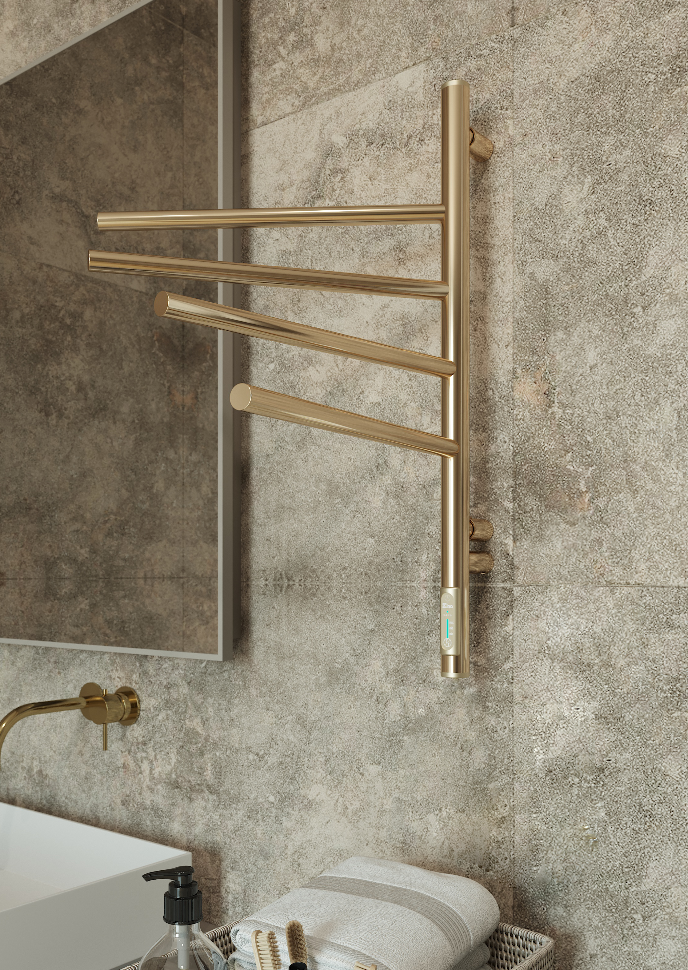 Elektryczny grzejnik łazienkowy Wertykal ze stali nierdzewnej o idealnie złoconej lustrzanej powierzchni ma 4 ruchome przęsła, każde z których obraca się o 180° niezależnie od drugiego.