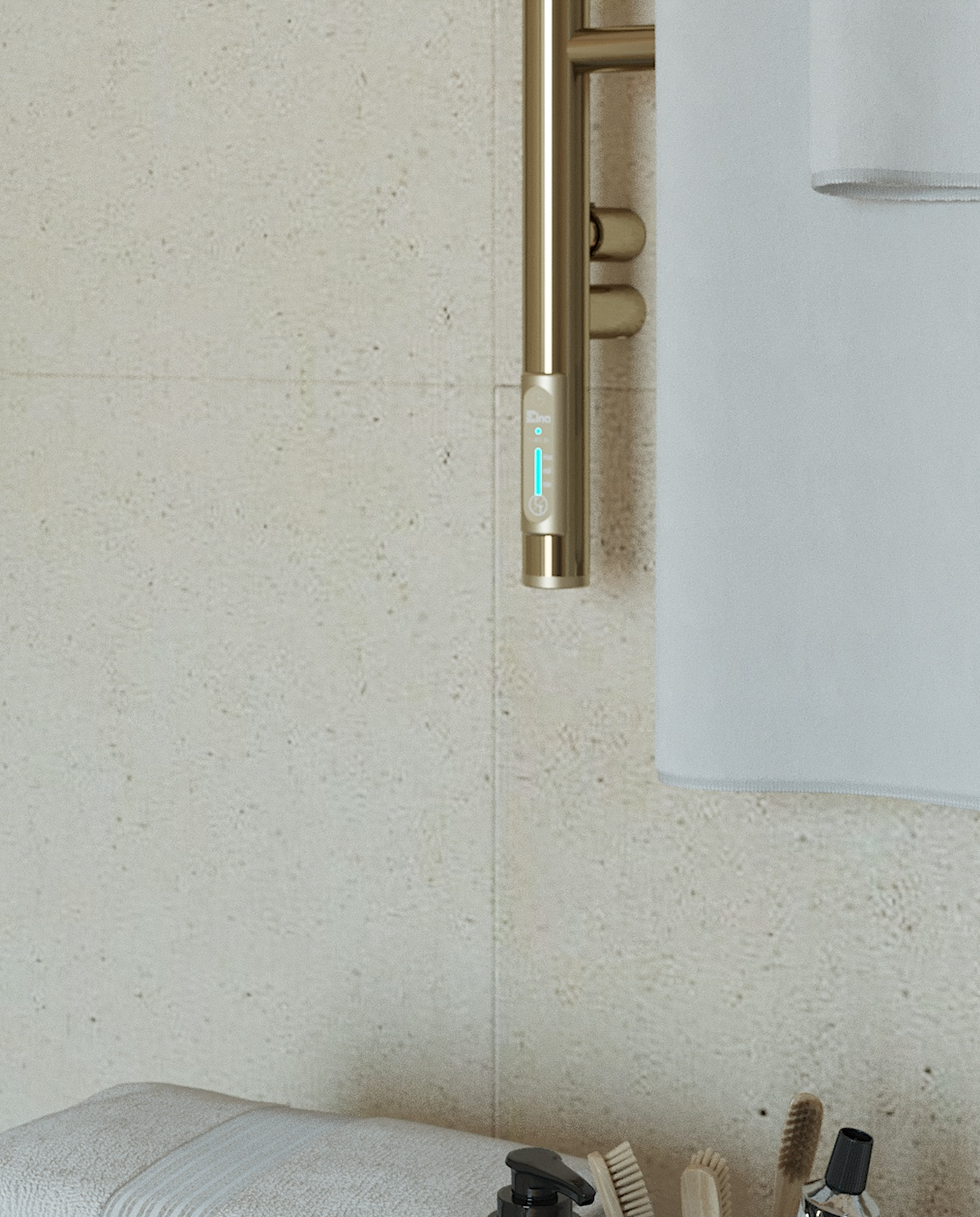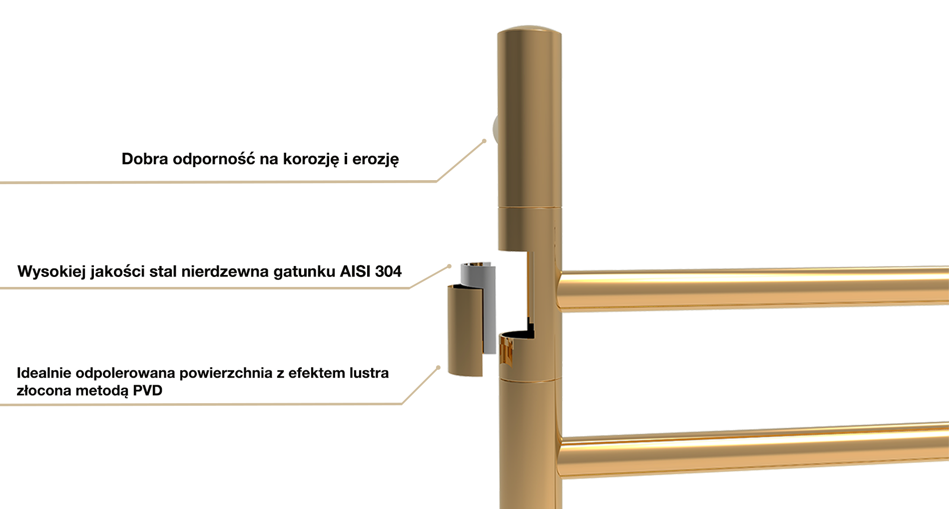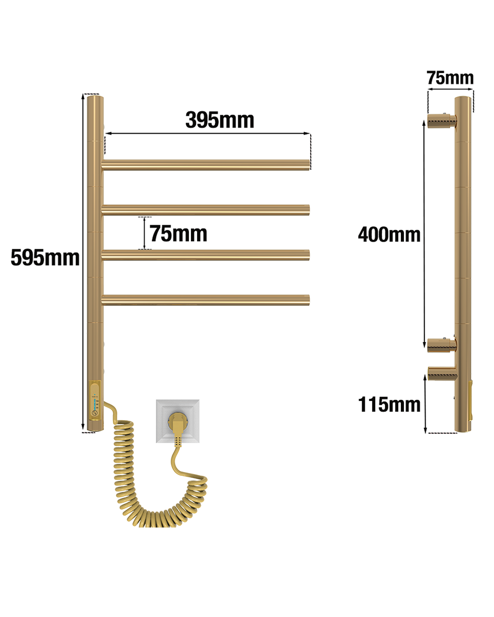 Elektryczny grzejnik łazienkowy Wertykal ze stali nierdzewnej o idealnie złoconej lustrzanej powierzchni ma 4 ruchome przęsła, każde z których obraca się o 180° niezależnie od drugiego.